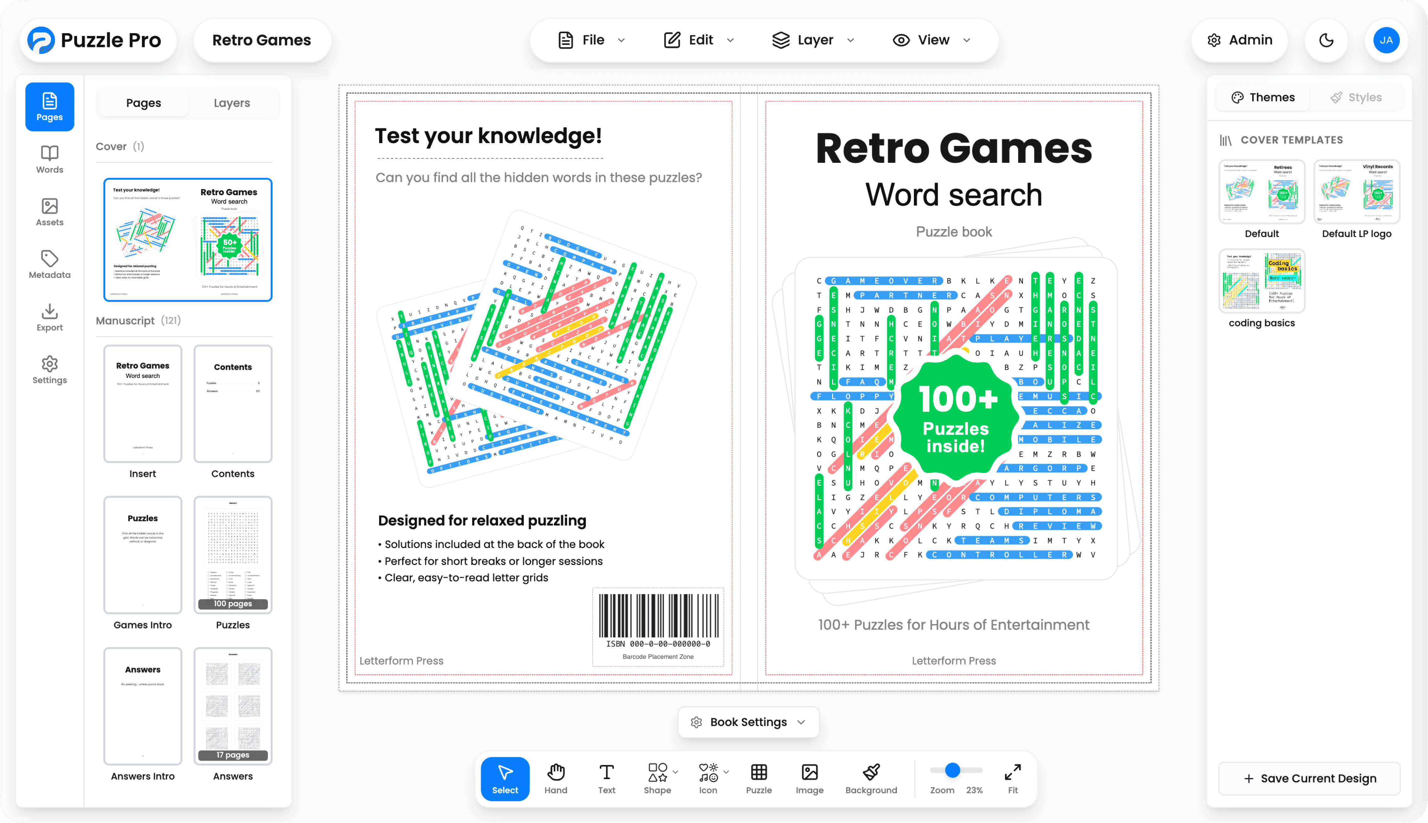 Set how many puzzle pages you want. Every puzzle is generated from your word list. Answer pages are created automatically (e.g. 6 puzzles per answer page). Cover spine width is calculated from your page count and paper type. Adjust the content spine offset for export so interior pages sit clear of the binding. Templates and generation handle layout and content. No design skills required. Just export.